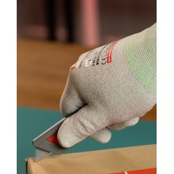Profondeur de coupe réglable (6–22 mm), Ambidextre (droitiers et gauchers), Bouton de verrouillage pour sécurisation de la lame, Curseur en caoutchouc pour un meilleur contrôle, Trou pour cordon de sécurité, Personnalisable avec logo ou slogan, Disponible en version lame dentelée et lame céramique, Changement de lame rapide selon version, Adapté aux opérations de coupe en environnement industriel et logistique